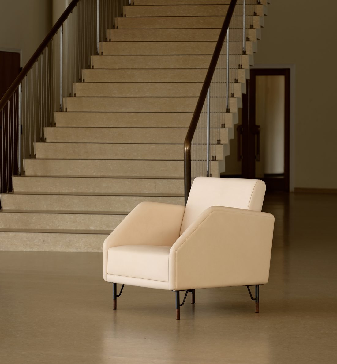 Inspireret af sine amerikanske kollegaer, tegnede Finn Juhl i 1953 en række nye møbler i et strømlinet og mere industrielt formsprog. Blandt disse var 77-stolen, hvis polstrede korpus synes at svæve på det spinkle, næsten usynlige benstel i bruneret stål. Bag det enkle ydre, gemmer der sig et tidskrævende håndværk og materialer af den fineste kvalitet. Lænestolen fremstilles i Danmark på et massivt blindstel i bøgetræ og polstres i hånden. Både det faste sæde og den løse ryghynde er med springindlæg, hvilket sikrer både komfort og lang holdbarhed. 77-stolen fås i tekstil eller læder med brunerede stålben og trætæer i eg eller valnød.
