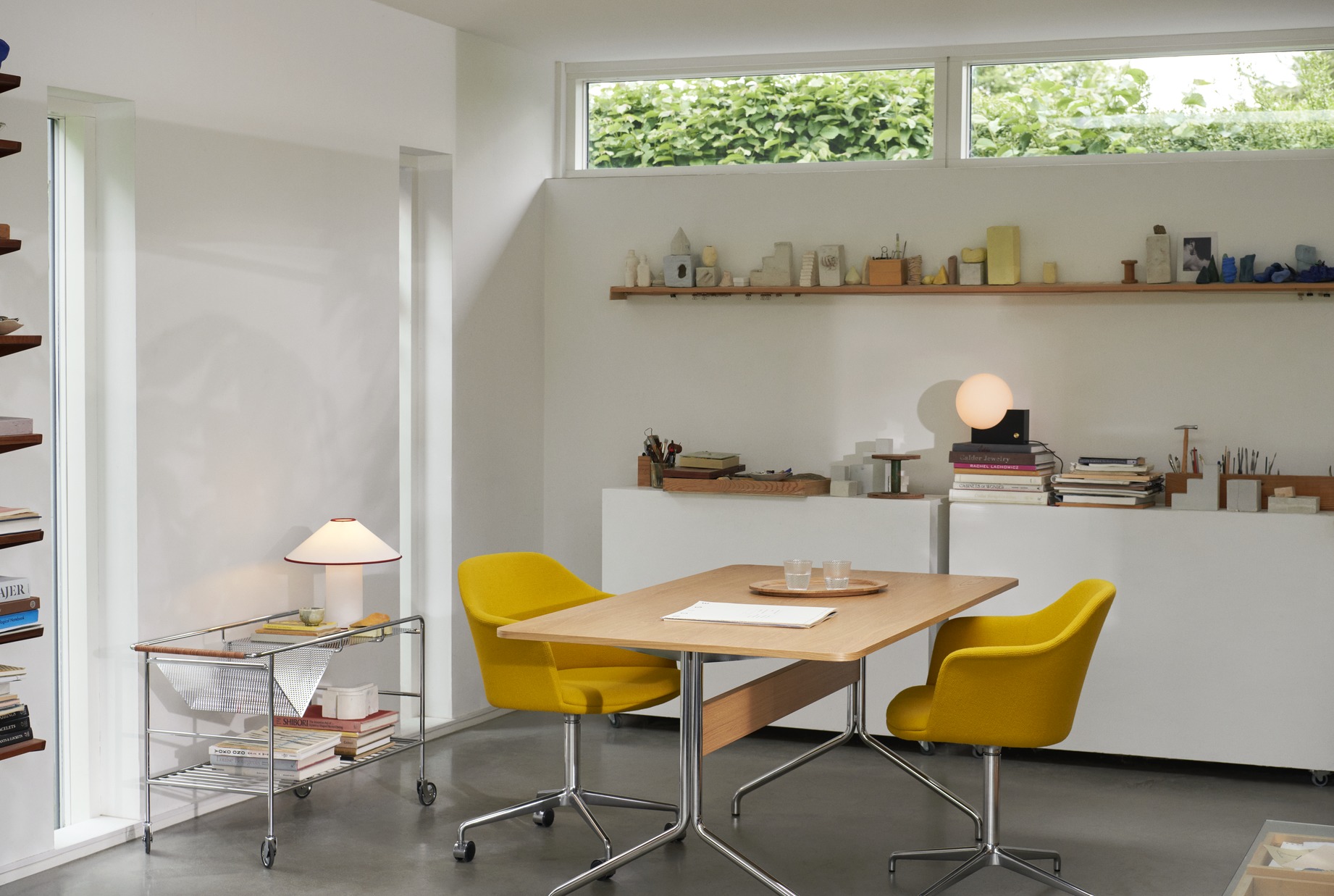 Bordet er inspireret af det ‘kreative kaos’ ved at arbejde hjemmefra. Note Design Studio ønskede at skabe en opbevaringsenhed, der skulle rumme deres samling af bøger, magasiner, tegninger og genstande. Resultatet blev en slank vogn med et karakteristisk V-formet design indbygget i overfladen, der gør det nemt at opbevare og udstille stablede bøger.