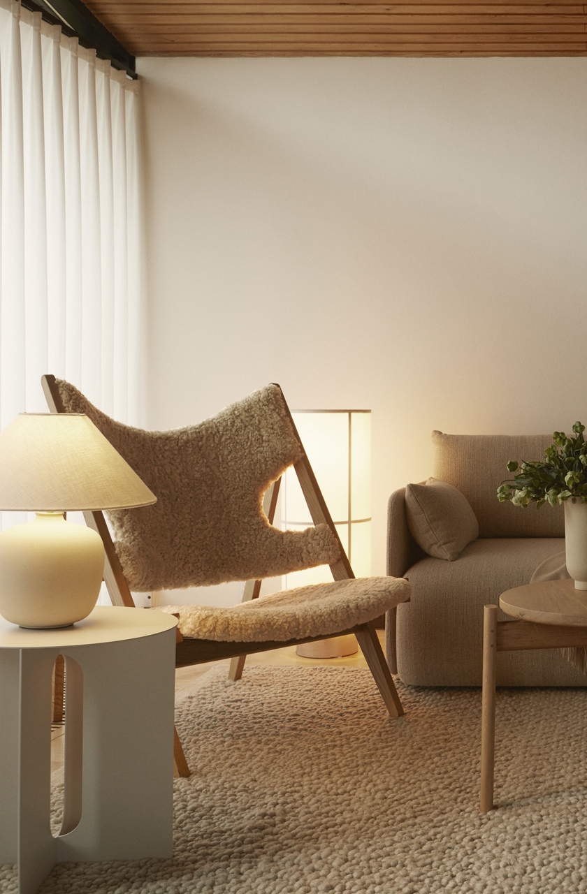 Ib Kofod-Larsens Knitting Chair blev første gang lanceret som en limited edition i 1951 og er nytænkt med et stel af naturligt egetræ, mørkbejdset egetræ eller valnød. Det karakteristiske møbel er omhyggeligt håndlavet i Sverige af dygtige håndværkere, der kombinerer traditionelle håndværksteknikker med moderne teknologi for at skabe et uforglemmeligt og tidløst design af højeste kvalitet.