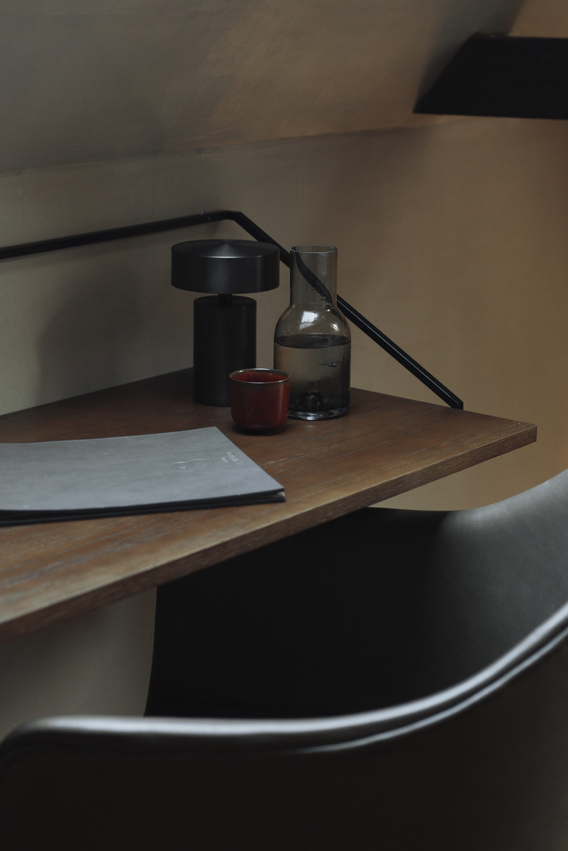Det minimalistiske stålbeslag er inspireret af gelænderet på en trappe. Træpladen fås i naturlig eller bejdset eg.